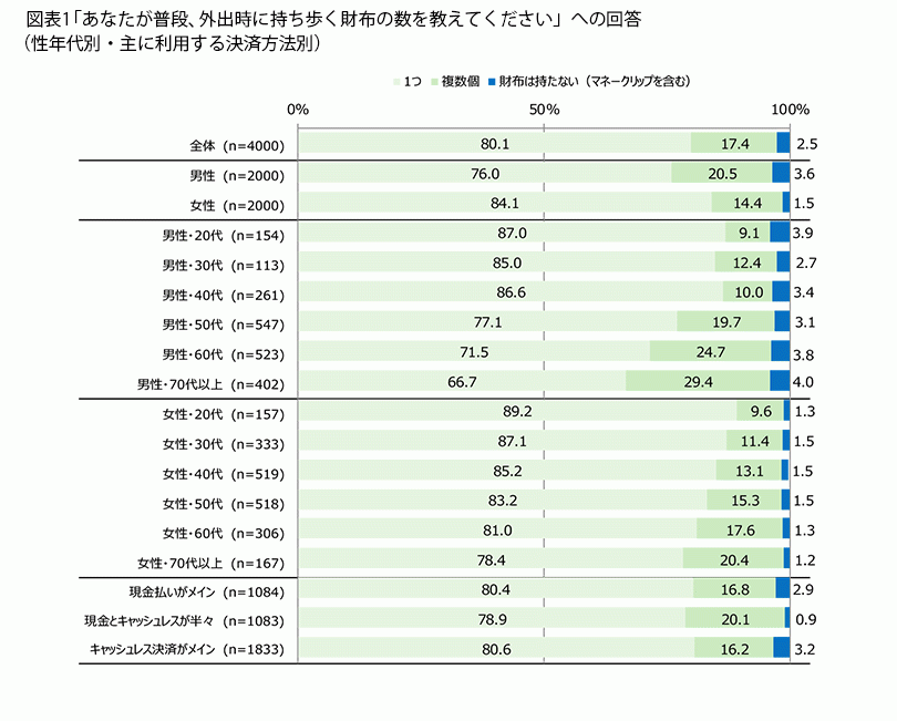 まずは、【外出時に持ち歩く財布の数】をきいてみました(図表1)。その結果、「1つ」が80.1%、「複数個」17.4%と、合わせて97.5%の人が財布を持って外出していると回答。キャッシュレス化が進んだとはいえ、現金決済のみのお店もまだ多いことから、財布はやはり外出時必携のアイテムのようです。