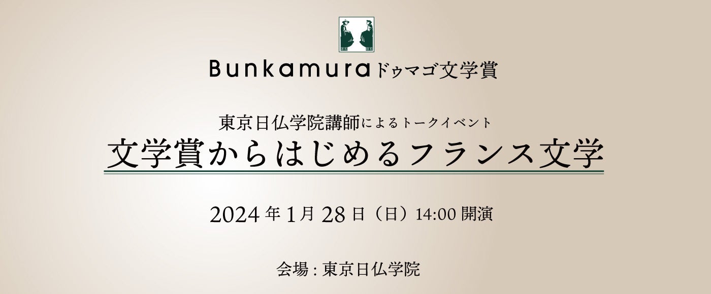 東京日仏学院にて開催。Bunkamuraドゥマゴ文学賞ホームページで「フランス文学の愉しみ」を連載している東京日仏学院講師(元メディアテーク(図書館)主任)の野村昌代が、フランスの主要な文学賞についてそれぞれの特徴や受賞作などを語るトークイベントです。