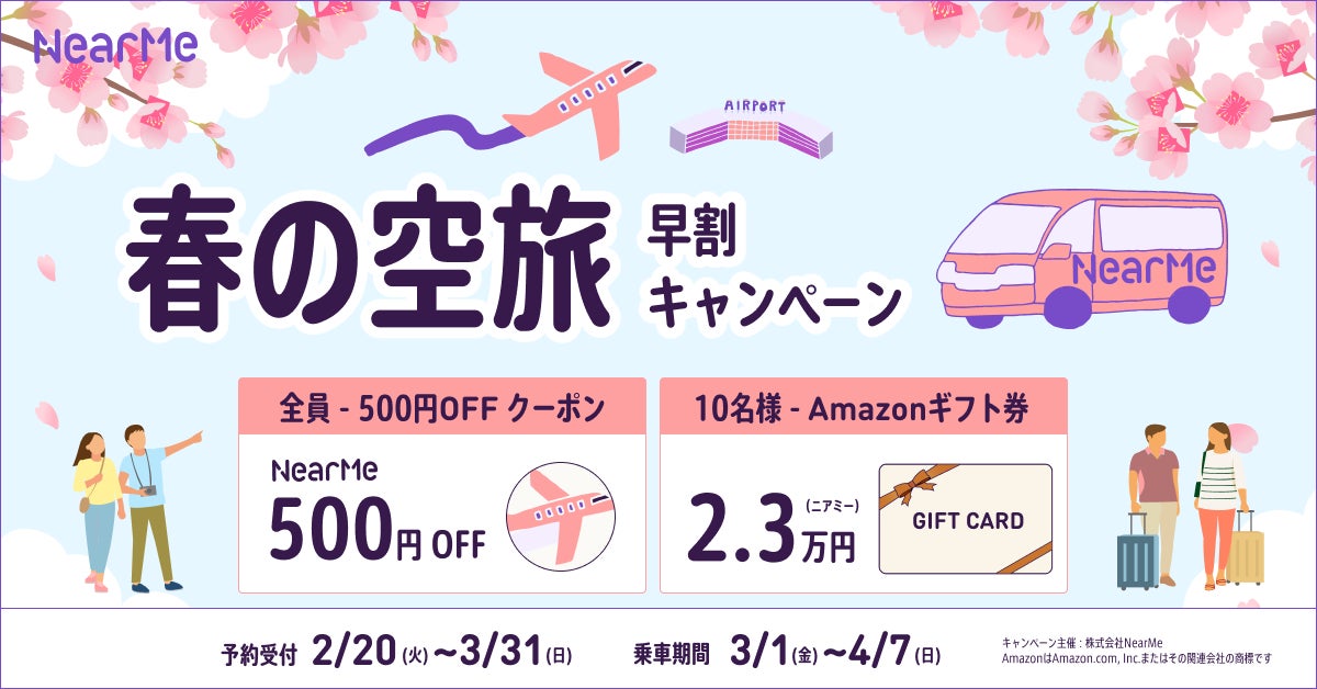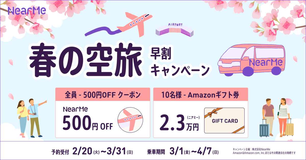 おでかけの季節 春の空旅をドアツードアの空港送迎で快適に!抽選でAmazonギフト券が当たるチャンス!【予約対象期間】2024年2月20日~3月31日【乗車対象期間】3月1日〜4月7日