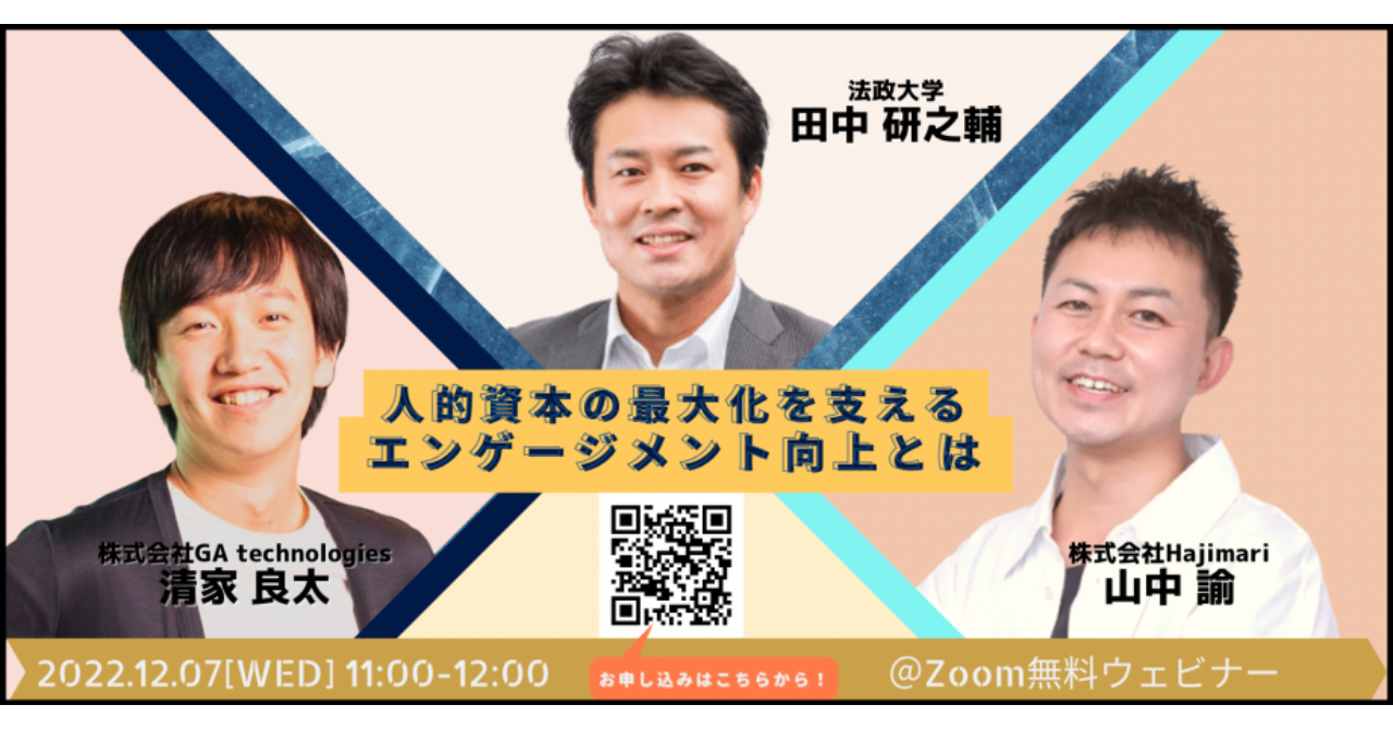 セミナーには法政大学・田中教授、株式会社GA technologies グループ人事室長・清家氏、株式会社Hajimari 執行役員・山中が登壇いたします。