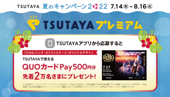 スマートフォンで使えるデジタルギフト『QUOカードPay(クオ・カード ペイ)』を展開する株式会社クオカード(以下当社、本社:東京都中央区、代表取締役社長:近田 剛)は、カルチュア・コンビニエンス・クラブ株式会社(本社:東京都渋谷区、代表取締役社長:増田 宗昭)が2022年7月14日(木)より開催する「TSUTAYAプレミアム 夏のキャンペーン2022」にて、TSUTAYAプレミアムまたはTSUTAYAプレミアム コミック+にお申し込みの上、TSUTAYAアプリから応募された先着2万名様にTSUTAYAで使える「SING/シング:ネクストステージ」オリジナルデザインのQUOカードPay500円分をプレゼントします。