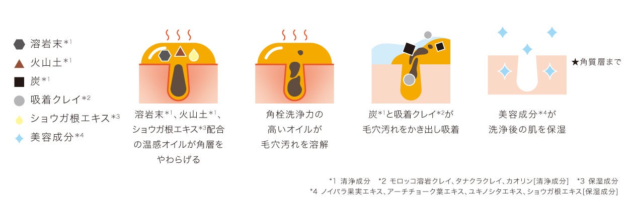 マグマのような温感オイルがじんわり肌をほぐしながら、メイクに素早くなじみ、毛穴汚れや角栓を溶かします。さらに、ミネラルパウダー*5がしつこい毛穴の黒ずみ*3、皮脂汚れを吸着してかき出します。