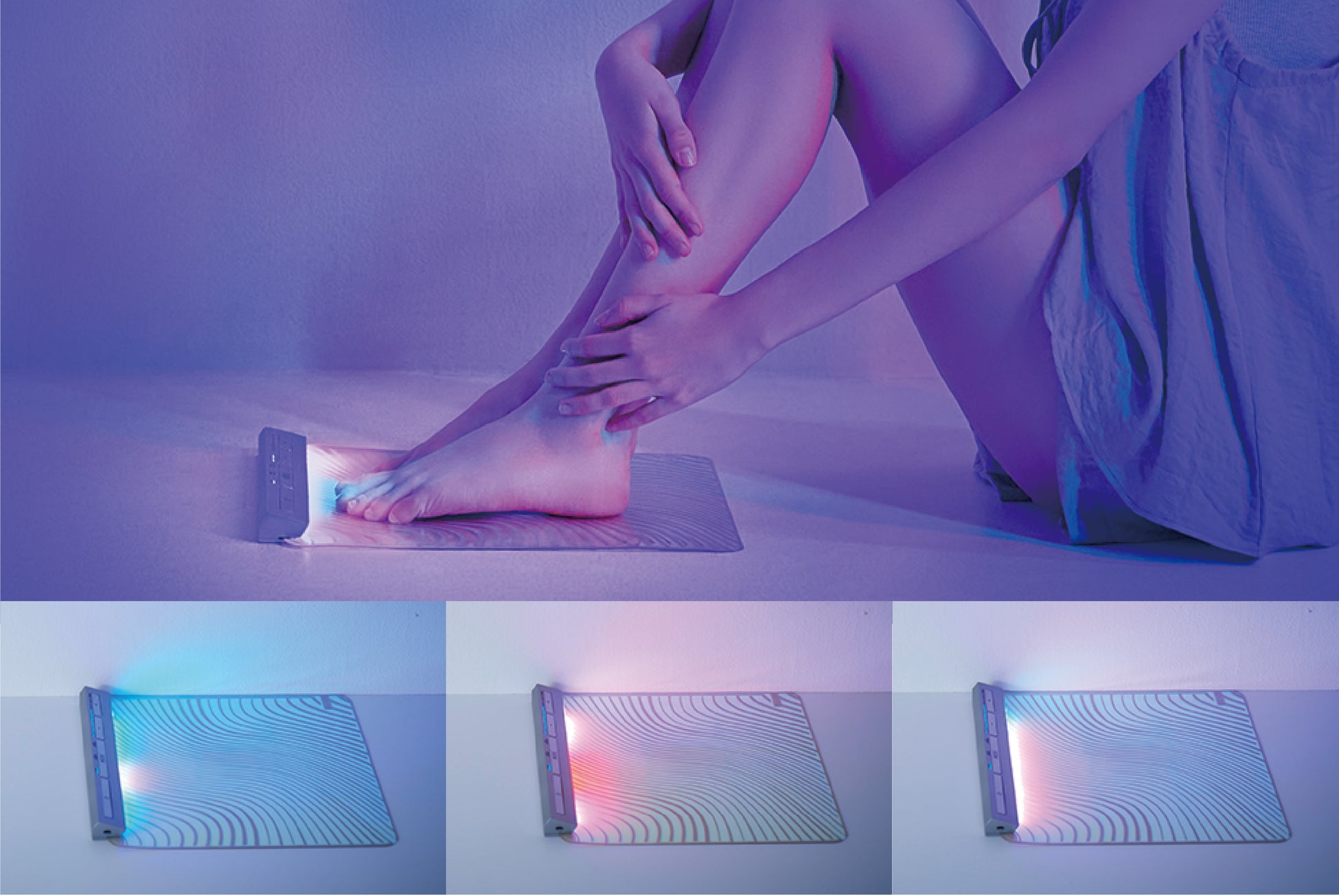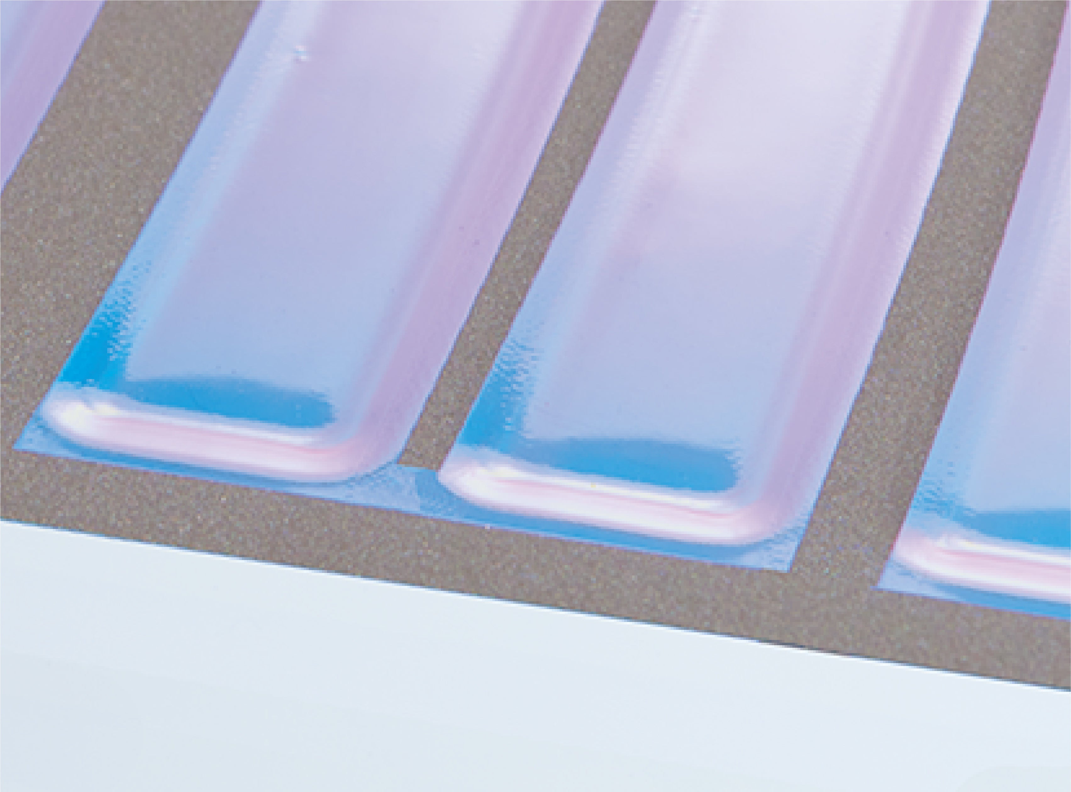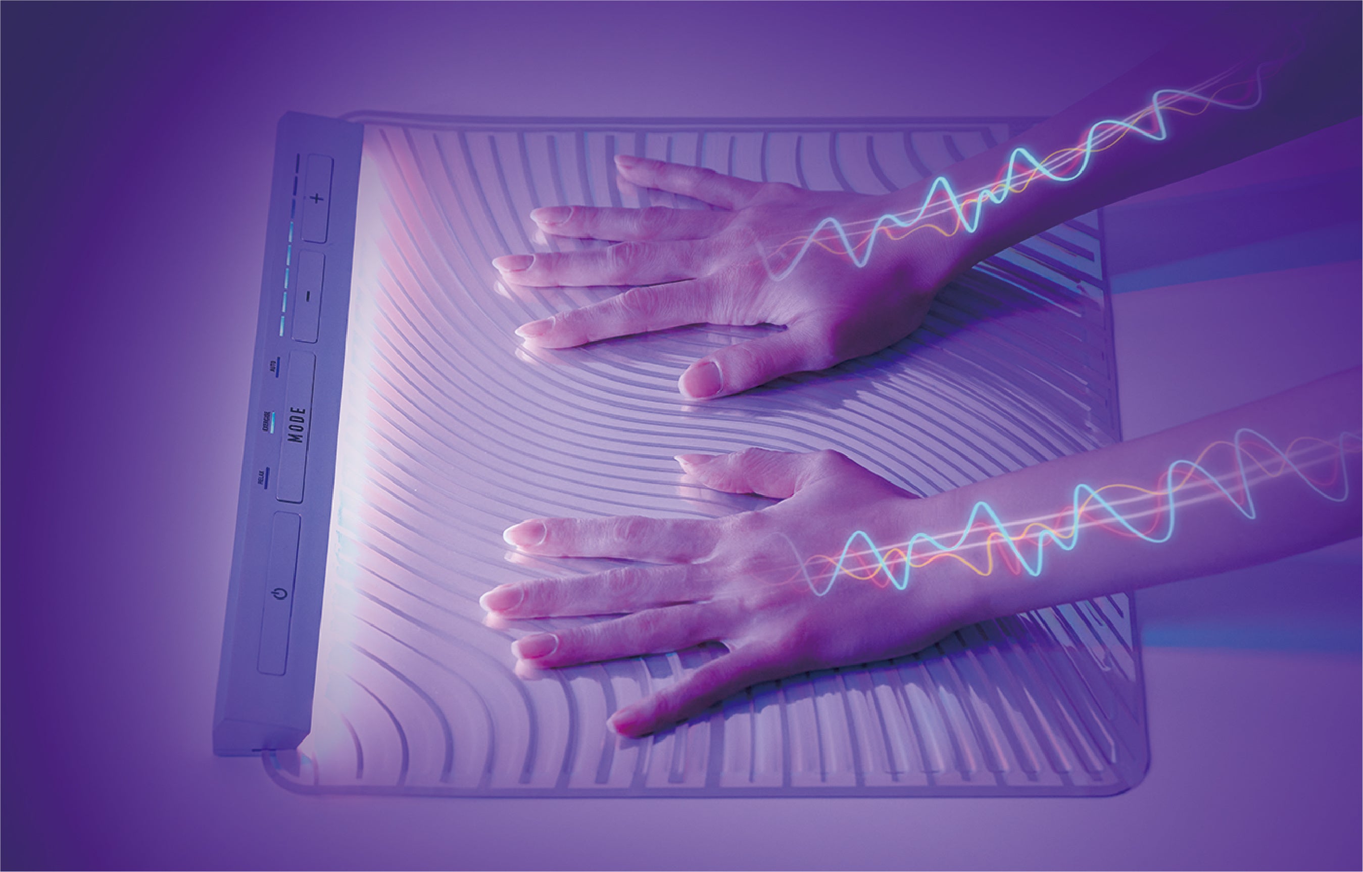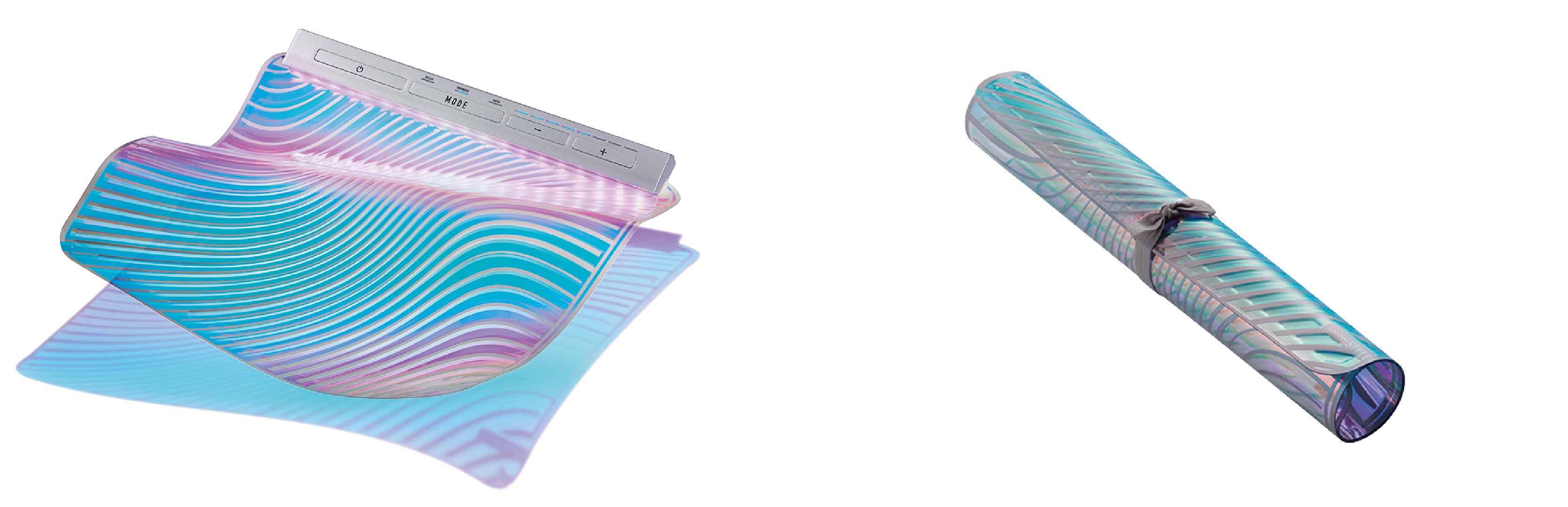 わずか1mmという薄さのPVCシートは前モデルから継承し、さらにそのシート上に凹凸加工を施しました。EMSが流れる波形の電極プリントラインを凸形状にすることで、必然的に肌と電極ラインの密着度が上がります。EMSの当たりを良くする効果に加え、凹凸加工が作り出す陰影とオーロラ柄の光の反射が相まって、1mmのシートに立体感が生まれ全体の高級感を演出します。