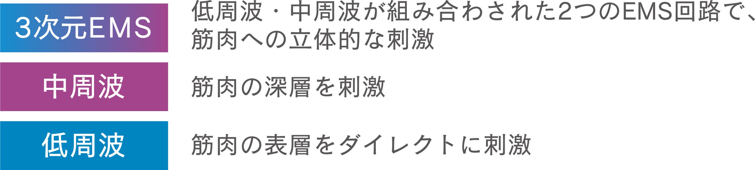 従来品※のEMS機構を大幅にバージョンアップさせ、EMSの回路を2つ搭載。低周波EMSと中周波EMSが同時に筋肉を刺激できるという、新しいシステム※“3次元EMS”を作り上げました。より深く、より広範囲にEMSの刺激を届け、今までにない複雑で重厚なEMSの体感と、確かな筋トレ効果が得られます。