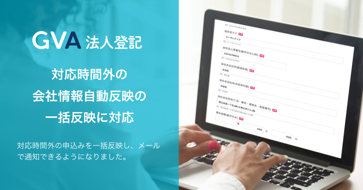 リーガルテックサービスの開発・運営を行うGVA TECH株式会社(本社:東京都渋谷区、代表取締役:山本 俊)は、GVA 法人登記にて提供中の会社情報自動反映機能をアップデートし、自動反映の対応時間外の申込み分についても利用可能なタイミングでシステムが会社情報を自動反映し、メールでの通知が可能になりました。