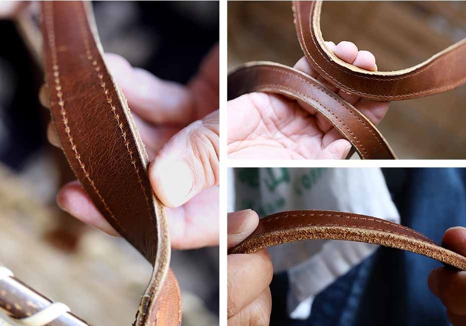 通常の竹籠バッグは丸籐を持ち手に使うことが一般的ですが、このバッグでは、牛革の持ち手を採用しました。職人がひとつひとつ丁寧にステッチを施したこの革ベルトは、見た目の美しさに加え、持ちやすさや手触りの良さが特長です。さらに、持ち手部分は細めに設計され、手にしっかりと馴染むため、長時間の使用でも快適です。