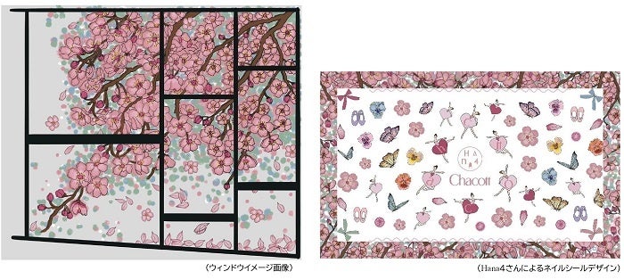 チャコット代官山本店2周年を記念して、アーティスト・Hana4さんとのコラボレーションが実現しました。Hana4さんは、 自身の原点である“ネイルアート”を軸に、アート/テキスタイル/イラストレーションなどの制作活動から、アートディレクションや広告まで、国内外問わず幅広く活動されています。四季を感じるHana4さんのアートワークが路面のウィンドウからCafe Coteau(カフェ コトー)を桜花爛漫に彩ります。