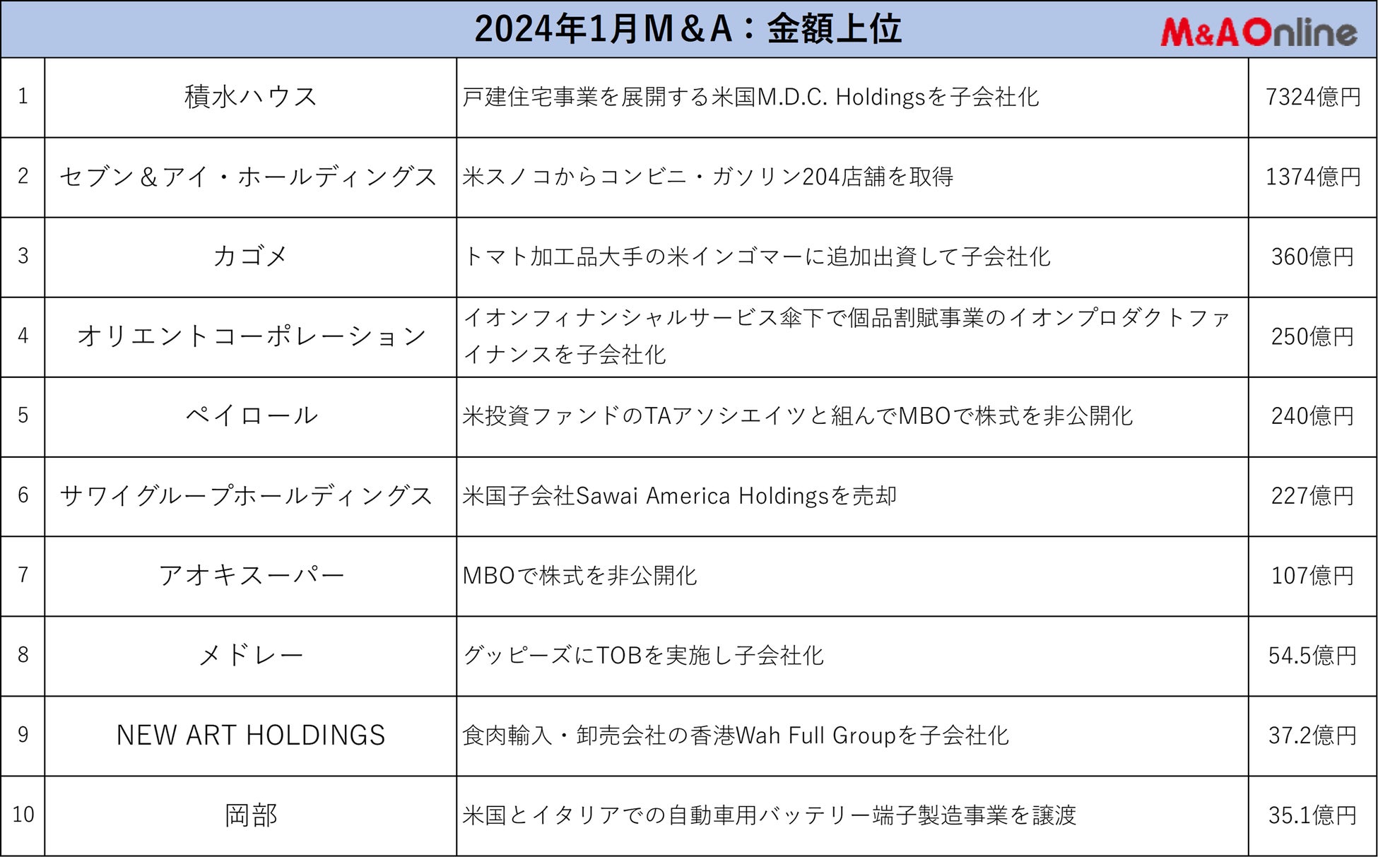 取引金額トップは、積水ハウスの案件。約7324億円を投じて米国で戸建住宅事業を展開するM.D.C. Holdings, Inc.(コロラド州)の全株式を取得します。積水ハウスは今回の案件が完了すると全米5位の規模のホームビルダーグループとなる見込みです。