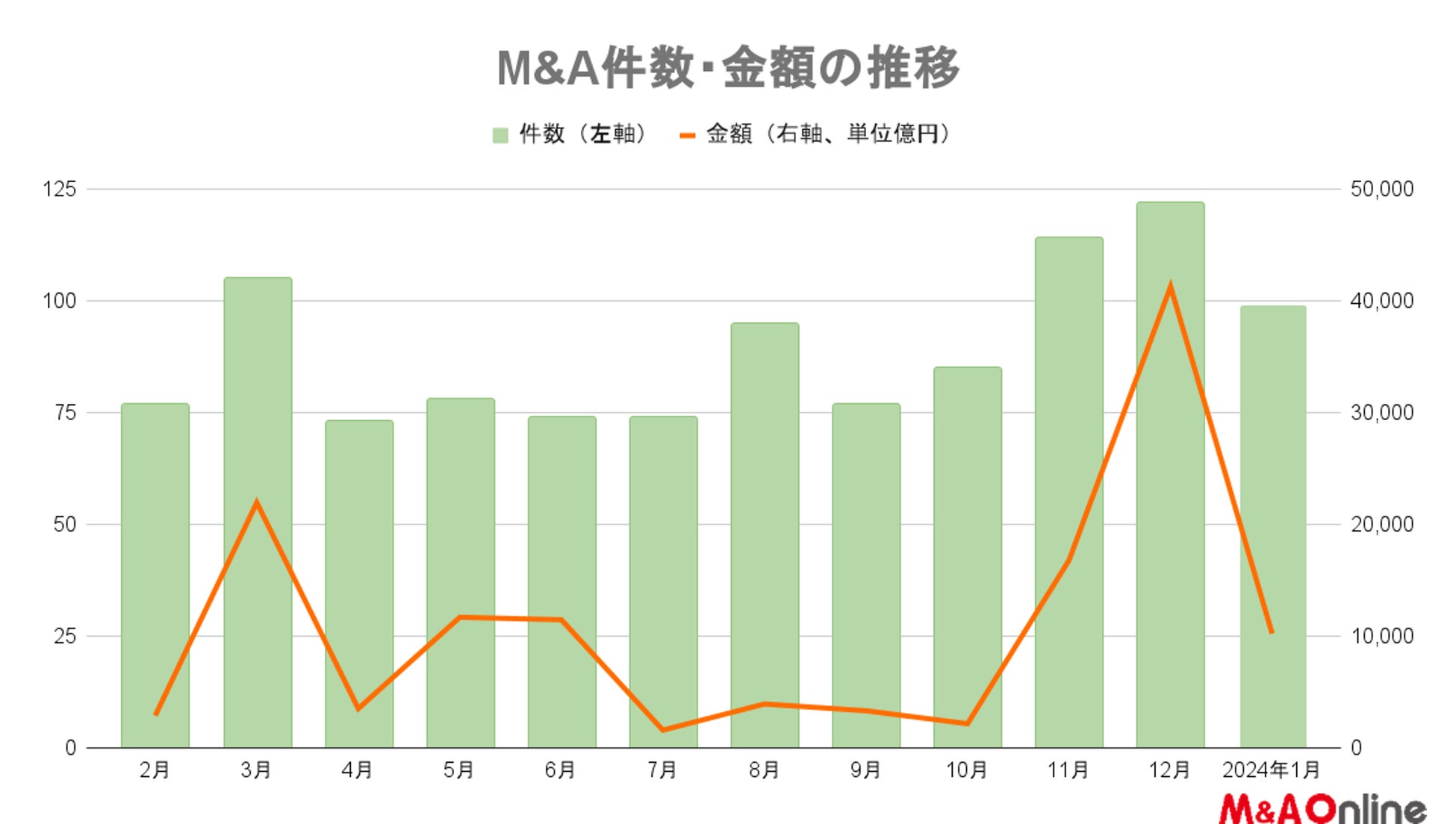 1月の総件数99件は、M&Aが活発に行われたことを示唆しています。月間100件を超える月は少なく、16年ぶりの1000件超えとなった2023年は3回、2022年は1回、それ以前は2008年3月まで遡らなければ該当月がありません。この好調な流れは2023年11月から始まっており、11月、12月は100件超えを連発、年明け1月も続いた格好です。
