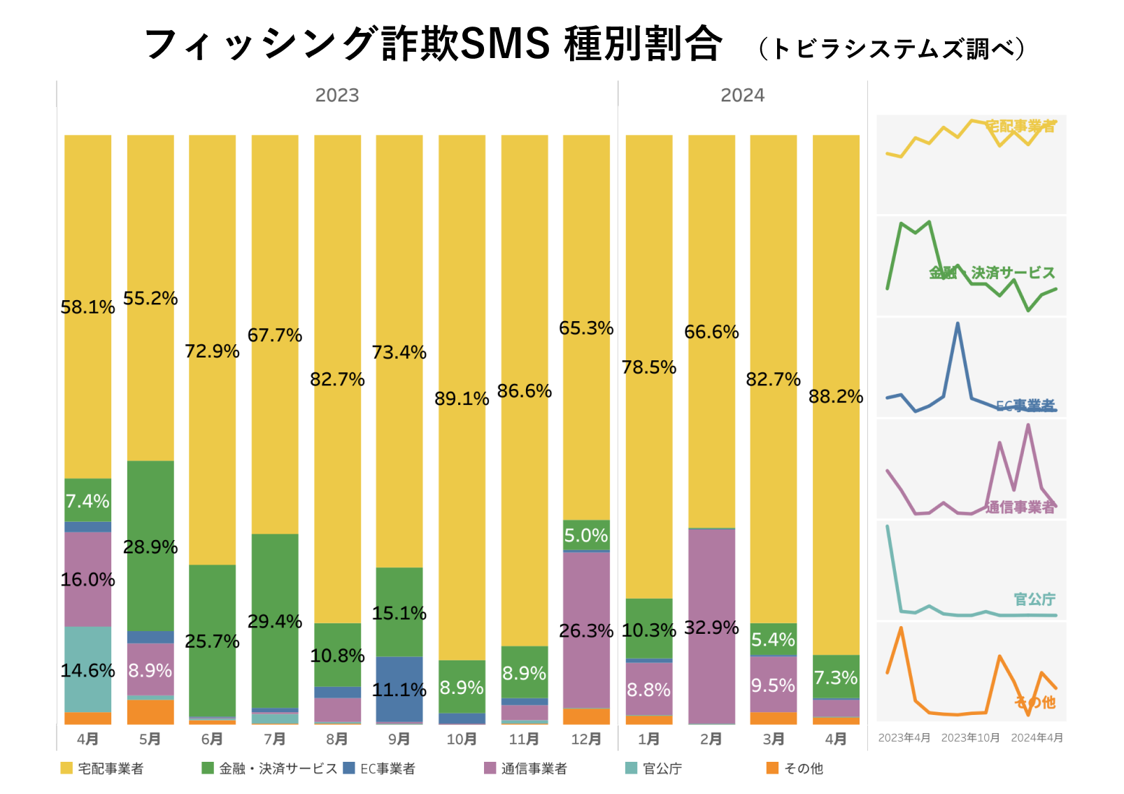 トビラシステムズの調査で、2024年4月に確認されたフィッシング詐欺のSMSの種別割合は、宅配事業者をかたる手口が前月から増加し88.2%を占めました。次いで金融・決済サービスをかたる手口が7.3%、通信事業者をかたる手口が2.9%となりました。