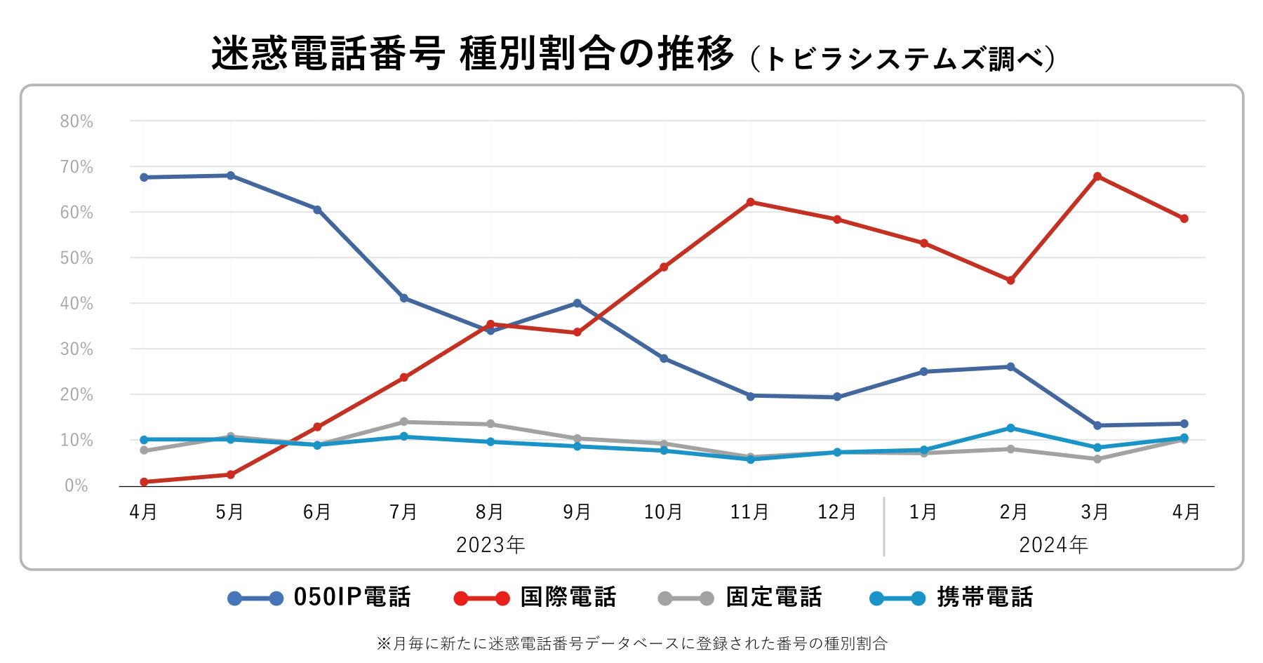 迷惑電話番号の種別割合で国際電話が58.4%、固定電話番号は詐欺SMSで利用増