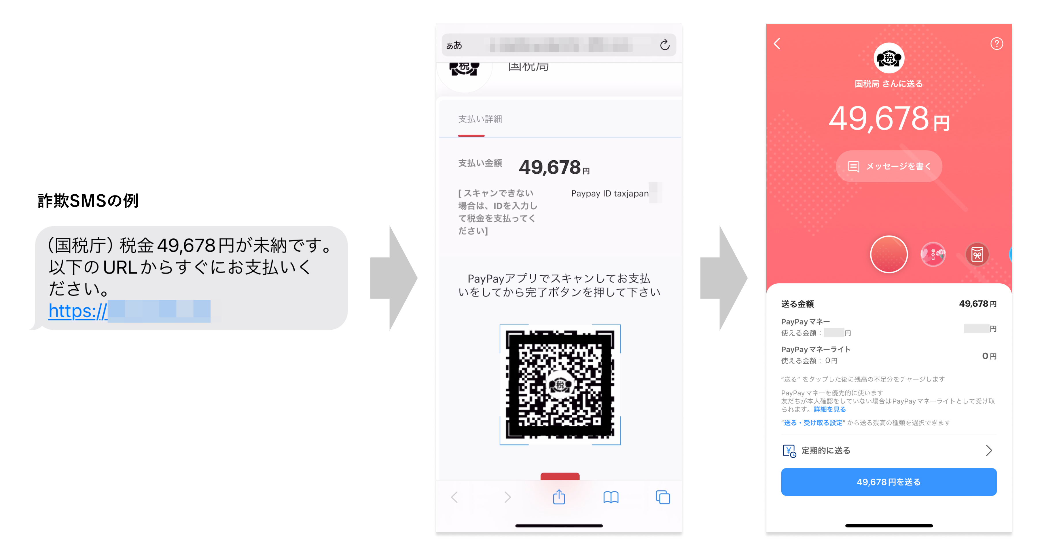 確認された手口は、国税庁をかたるSMSのURLをタップすると、架空の未納税金の支払いを求める偽サイトにアクセスし、電子決済サービスで二次元コードをスキャンするよう促し送金させるものです。