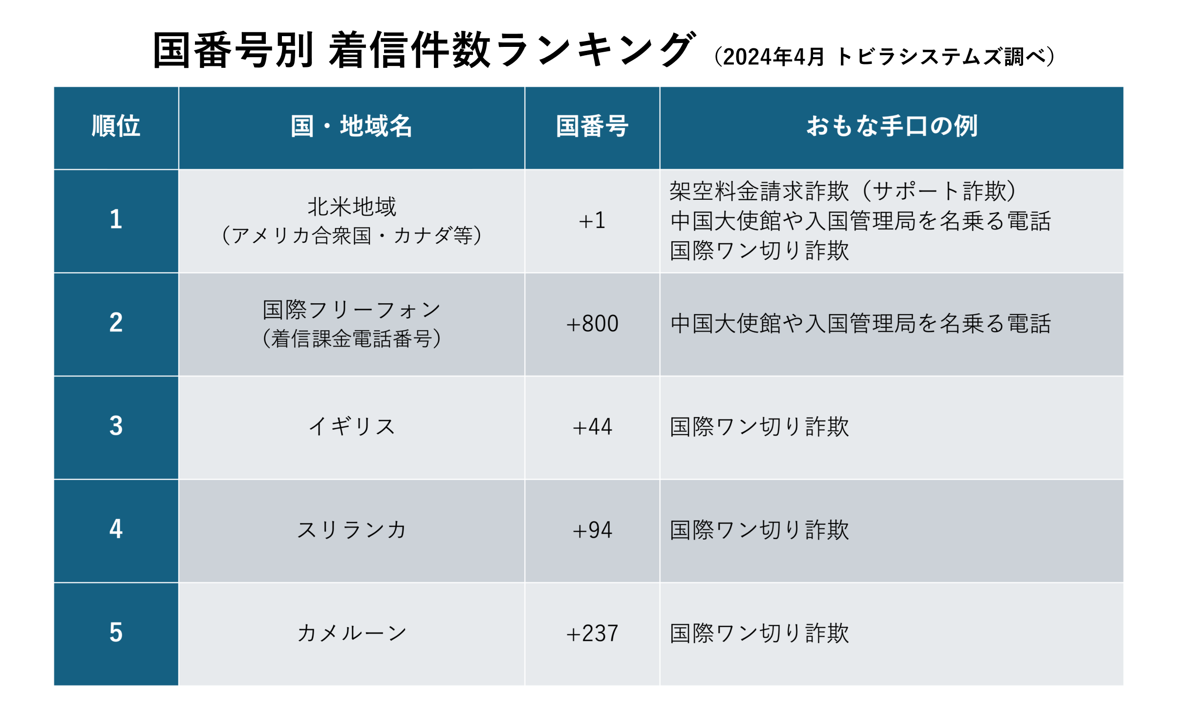 当社の調査で、2024年4月に着信件数が多かった国際電話の国番号は、上位からアメリカ合衆国やカナダなどの北米地域、国際フリーフォン、イギリス、スリランカ、カメルーンでした。