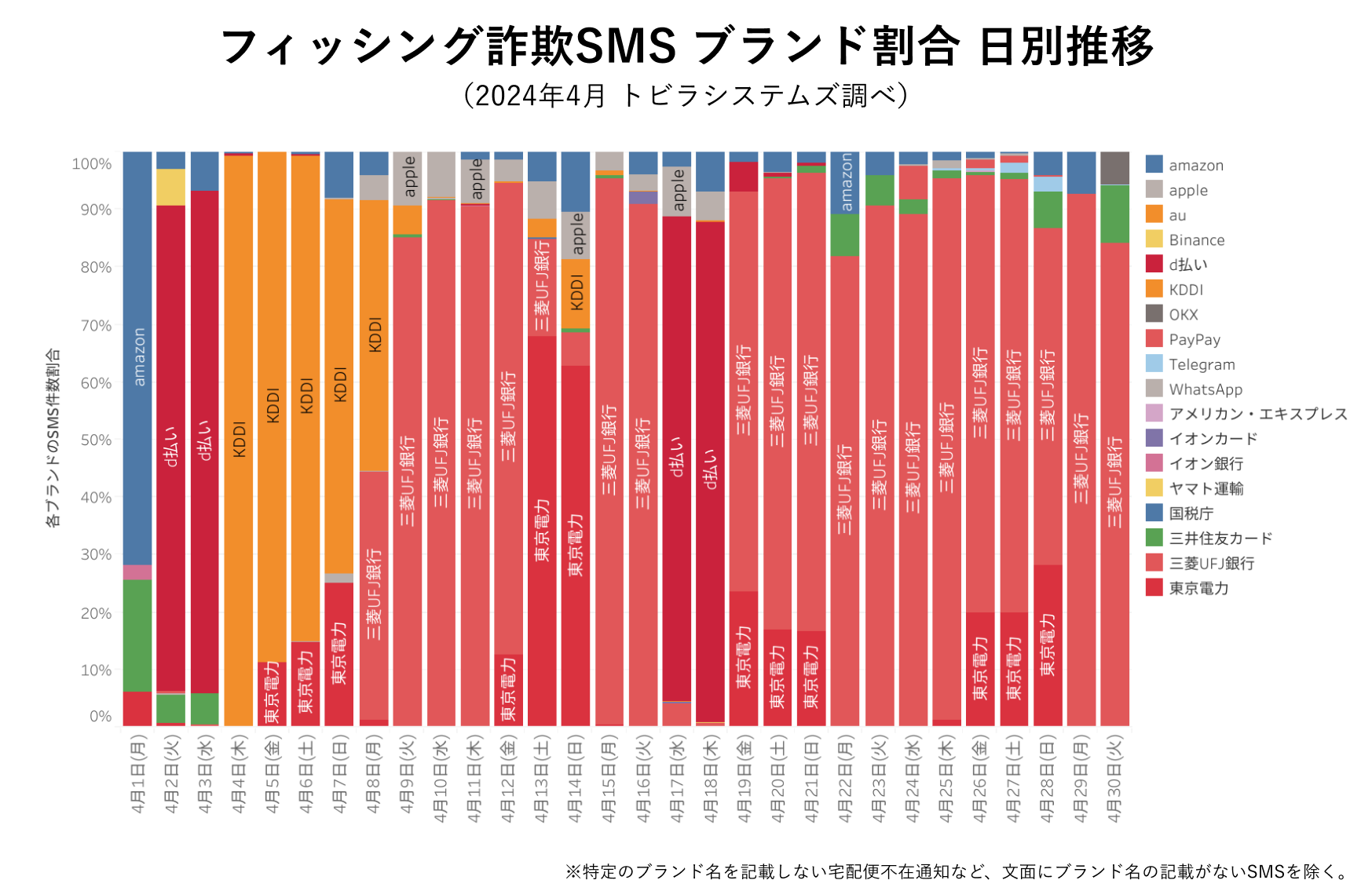 2024年4月は、多様な企業名やブランド名が詐欺SMSの文面に悪用されました。特に悪用が目立ったものに「d払い」「KDDI」「三菱UFJ銀行」「東京電力」などがありました。