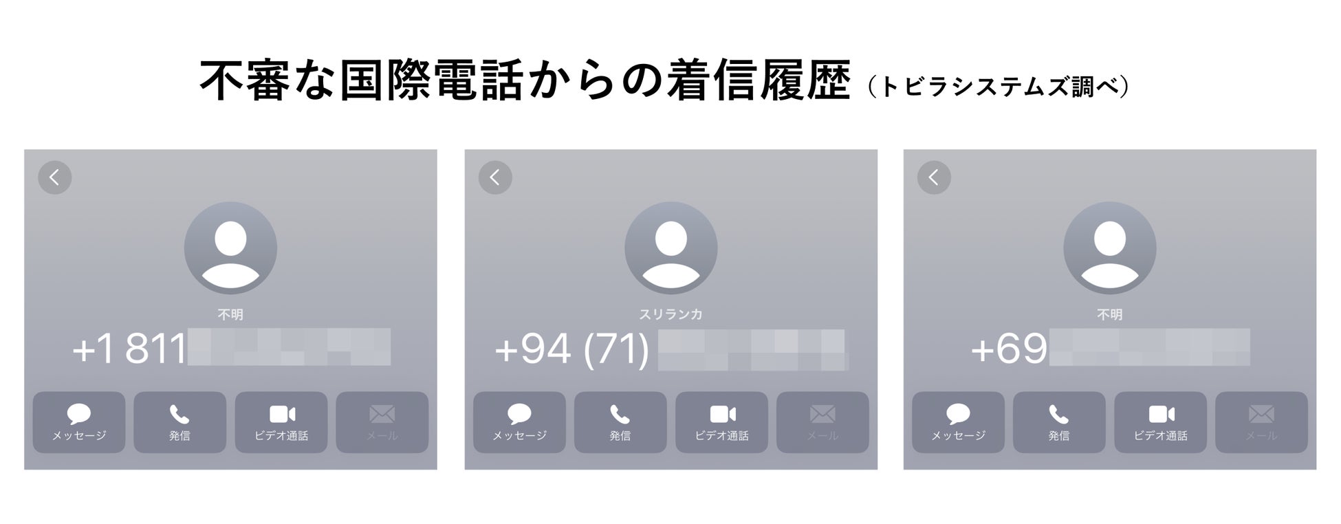 なお、2024年4月は、国番号として使用されていない番号(+28, +29, +69, +80など)からも、不審な自動音声ガイダンスやワン切り着信などの電話が発生しています。