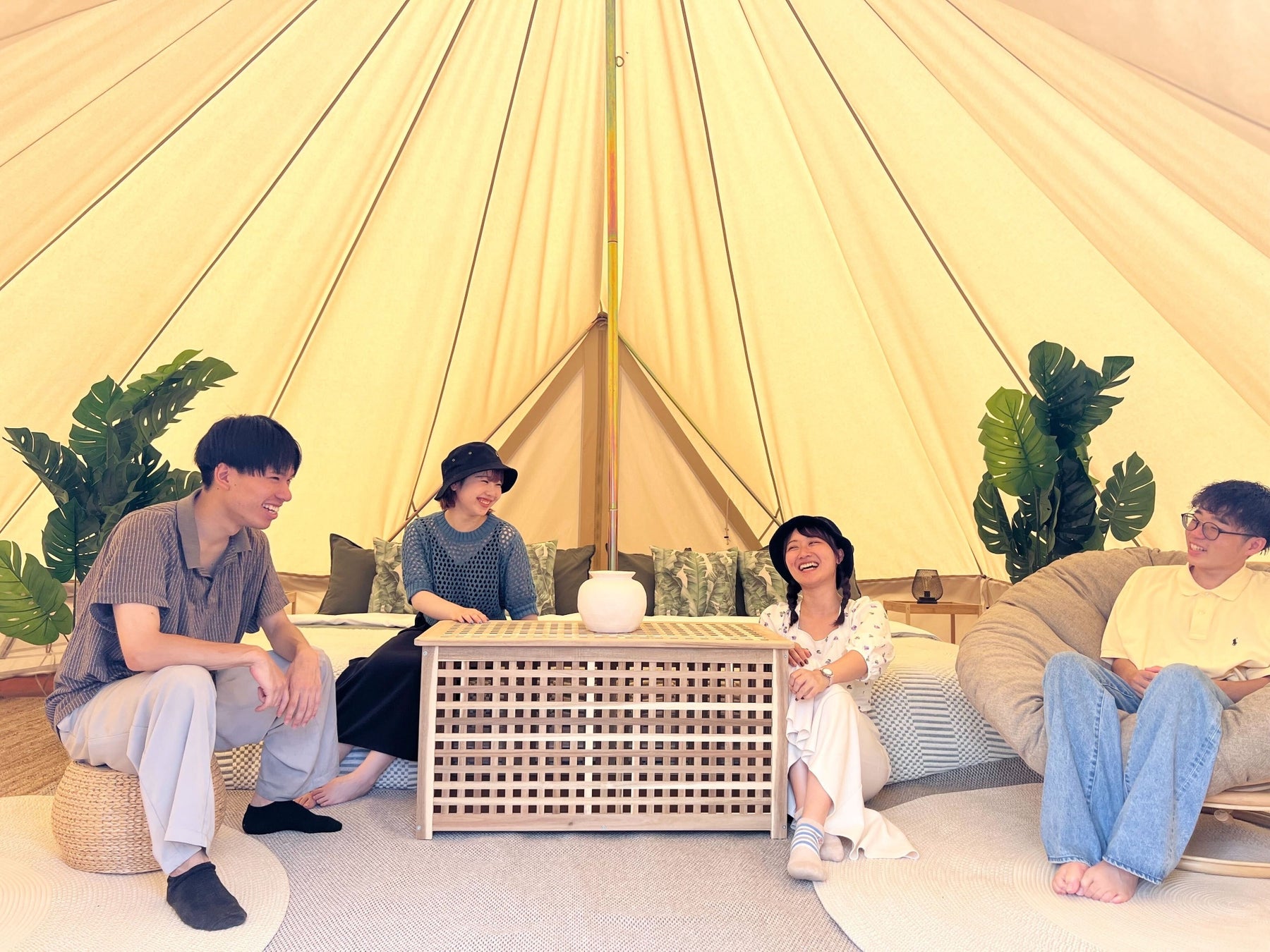 コンセプトの「森の中のオアシス」の名の通り、テント内でもみどりを感じられる内装で統一しており、老若男女問わず好評をいただいております。