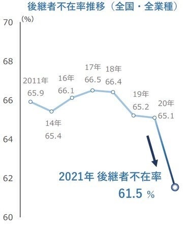 全国・全業種約26万6000社を対象とした2021年11月22日に公開された帝国データバンクの調査結果によると、全国の後継者不在率は61.5%となり、20年の不在率65.1%から3.6ptの減少と大幅に改善し、4年連続で不在率が低下した。これは調査を開始した2011年以降で最低の数字であると共に、全業種で後継者不在率が70%を下回ったのは過去初めてのこととなる。