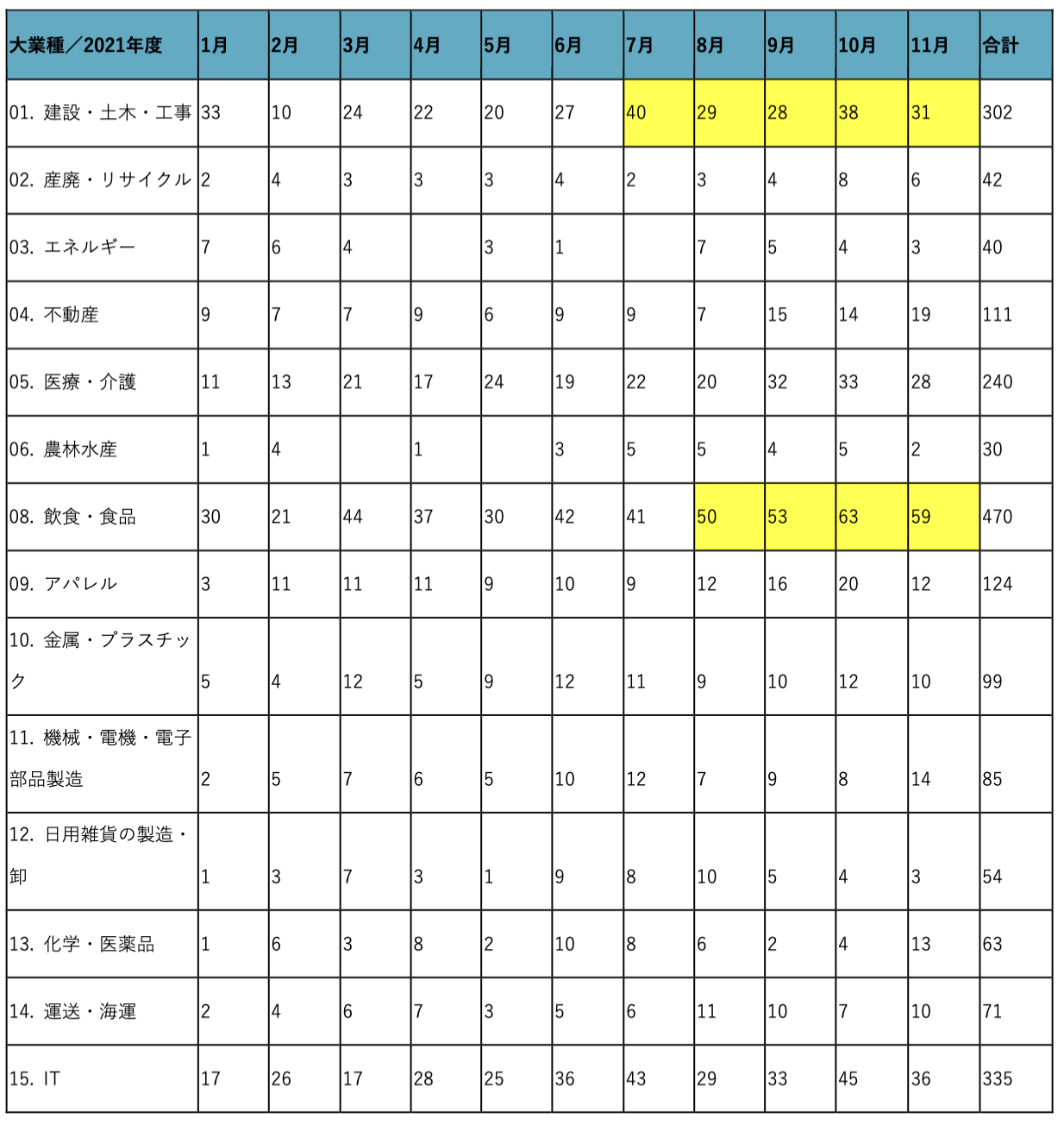 また、7月以降で建設・土木・工事が増加している傾向が見られる。各種小売店や飲食店舗が閉店・時短営業・休業を強いられたことにより、それまで定期的に発生していた新規店舗の出店・店舗のリニューアルなどの関連工事が激減したことが影響していることに加え、2021年3月頃から住宅の柱や梁などに使う建築用木材の需要が供給を上回って輸入木材の価格が高騰するウッドショックが起こったため、木材が手に入らず木造建築の工事が止まってしまうなどの影響から会社の譲渡を検討する経営者が増加したのである。なお、建設・土木・工事の案件の2019年1月〜11月の全体案件数における割合は5%であったが、2021年1月〜11月の全体案件数における割合は9%と4 ptも増加している。