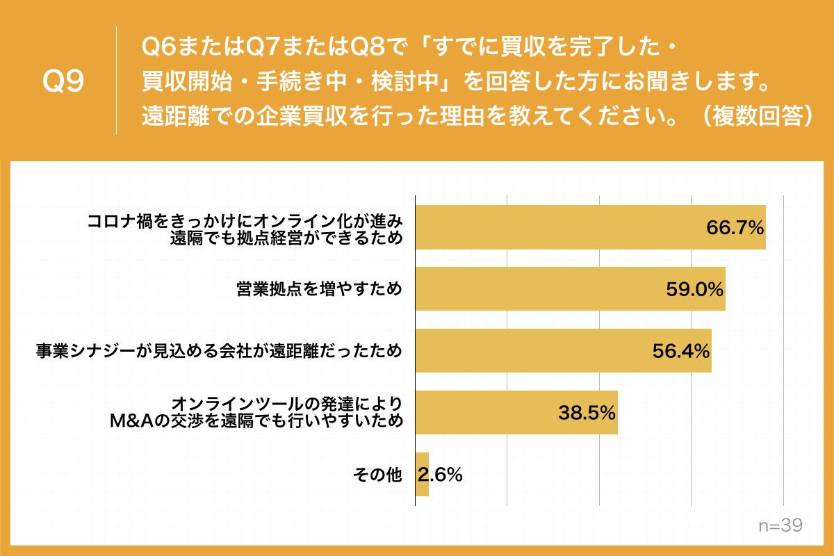 成約の組み合わせに着目すると、更に興味深い事実が見えてくる。従来対面でのマッチングにこだわる日本では、地域を超えた遠隔地とのマッチングが多くなるネットを使った事業承継マッチングは不向きと言われてきた。しかしバトンズが実施した「2021年12月版M&A需要動向」に関する調査によると、2019年〜2020年に遠隔企業間でのマッチングが成立したケースは30%であったが、2021年には37%と7 pt増加した。これは新型コロナウィルス感染症の拡大による急速なオンライン化に加え、緊急事態宣言などの影響で一極集中から多拠点へと経営戦略の転換などが行われたことが背景にあるものと推定される。
