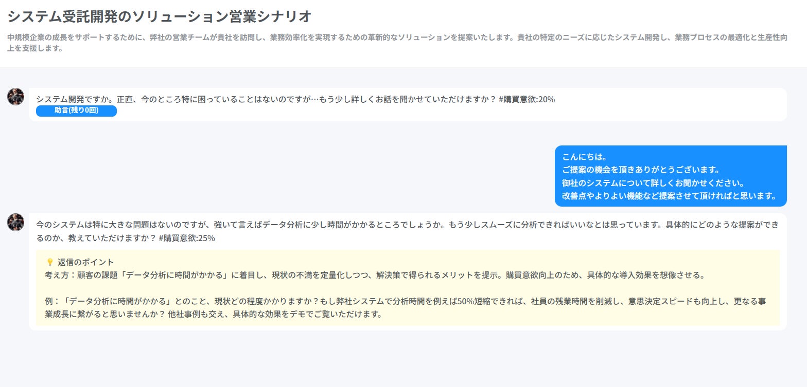 今回追加された「助言機能」では、営業シナリオを進行しながらリアルタイムで具体的なアドバイスを受け取れるようになりました。ひとりで学習していて行き詰まってしまった・・・解決策がわからない・・・などの声をヒントに新たに開発を行いました。営業場面ごとに適切な対応方法が示されるため、実践的なスキルアップが可能です。