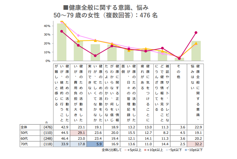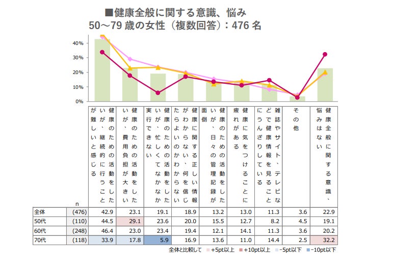 ・健康に関する悩みとしては「健康のための活動をしたいが、継続的に行うことが難しいと感じる」が最も多く42.9%。一方、「健康全般に関する意識、悩みはない」も全体で22.9%、70代では32.2%を占める。