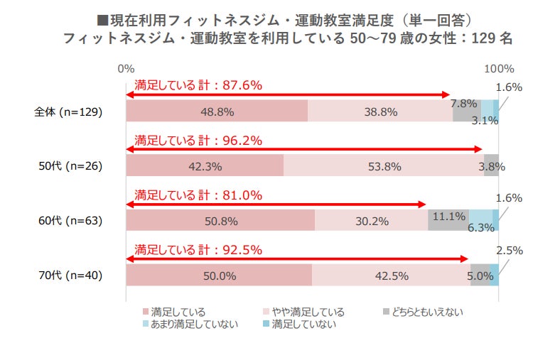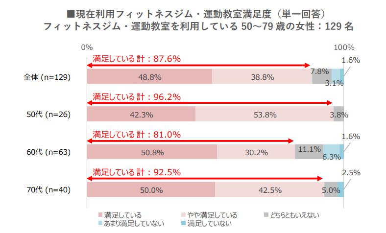 ・フィットネスジム・運動教室満足度(「満足している」+「やや満足している」)は全体で87.6%と高い。