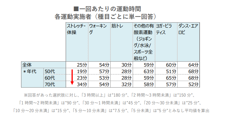 ⇒一回あたりの平均運動時間は「ストレッチ・体操」が25分、「ウォーキング」は54分。
