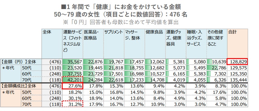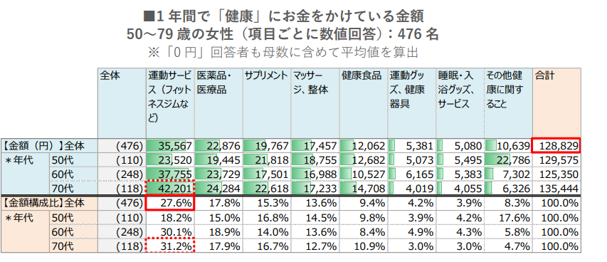 ■1年間で健康にかけている平均金額は全体で「128,829円」。そのうち「運動サービス」の占める割合は27.6%。