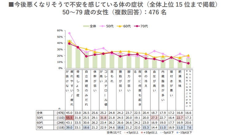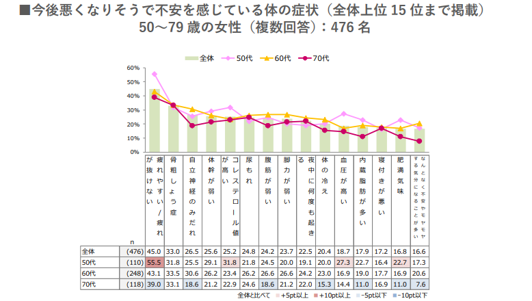 ・今後悪くなりそうで不安を感じている体の症状は、「疲れやすい/疲れが抜けない」が最も多く45.0%、次いで「骨粗しょう症」(33.0%)、「自立神経のみだれ」(26.5%)と続いた。