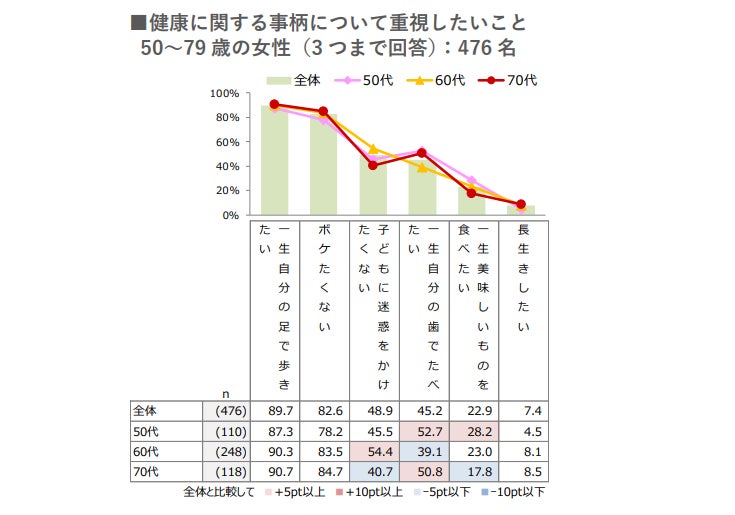 【シニア女性の健康に関する意識と実態調査】健康に関する価値観は「一生自分の足で歩きたい」「ボケたくない」が高い一方、「長生きしたい」と考える人はわずか7.4%。