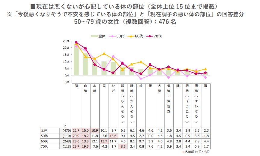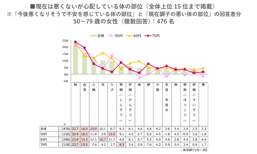 ・現在は悪くないが、心配している体の部位は、「脳」が最も多く+22.7ポイント、