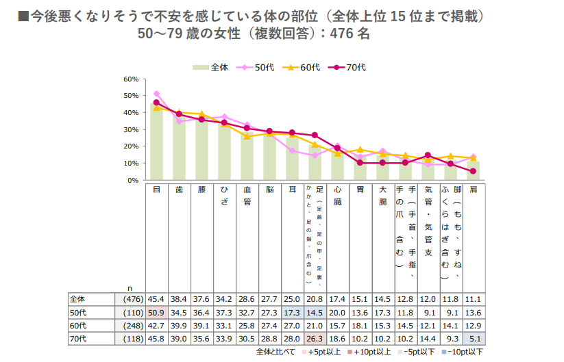 ・現在は悪くないが、心配している体の部位の年代別特徴としては、50代で「ひざ」、60代で「耳」、70代で「腎臓」が上位に挙げられている。