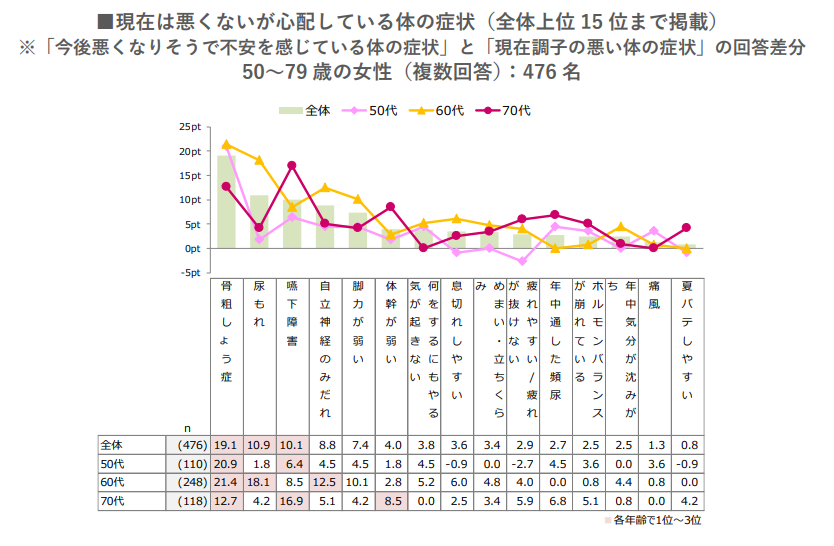 ・現在は悪くないが、心配している体の症状は、「骨粗しょう症」が最も多く+19.1ポイント、
