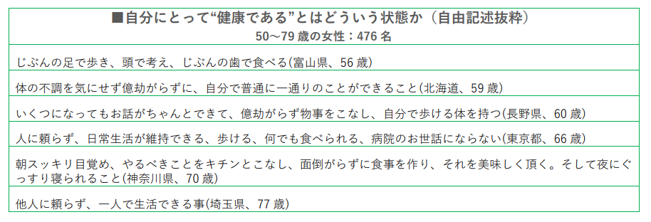 「長生きはしたくないが、健康寿命は延ばしたい。」「人の介助や病院・薬に頼ることなく、今普通にできていることを億劫がらずに続けたい。」これが今回の調査で明らかになった50~70代の健康に対する意識です。中でも「自分の足で歩ける」「トイレ・入浴・排泄・物事の判断が自分でできる」「おいしい食事を作って、自分の歯で食べられる」という身体的な継続欲求が強い様子が、自由記述から伺えました。