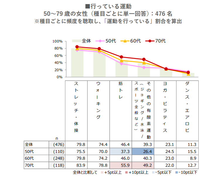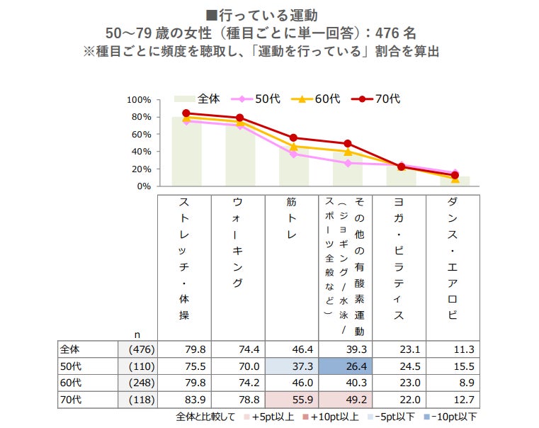 ・70代は「筋トレ」や「その他の有酸素運動(ジョギング/水泳/スポーツ全般など)」の実施割合が他年代に比べて高い。