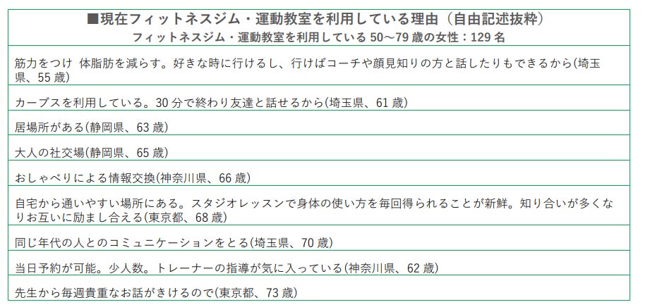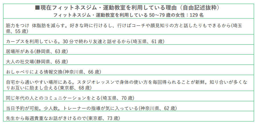・現在フィットネスジム・運動教室を利用している理由の自由回答を見ると、体を動かすという目的のほか、「コミュニケーション目的でジム・運動教室に通っている」といった回答も見られた。