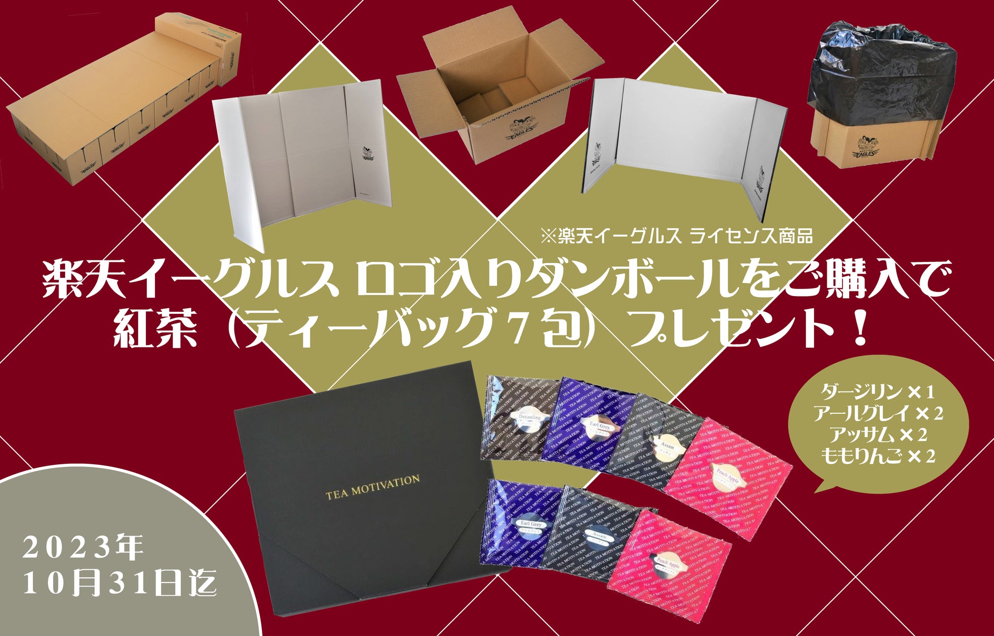 ダンボール専門販売サイト「だんぼーる本舗」は、10月4日(水)~10月31日(火)の期間限定で、楽天イーグルスロゴ入りダンボールを購入された方を対象に紅茶のプレゼントキャンペーンを実施いたします。
