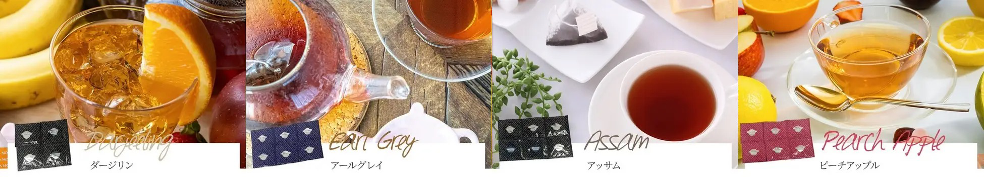 「ダージリン」1包、「アールグレイ」2包、「アッサム」2包、「ももりんご」2包の全7包入りです。
