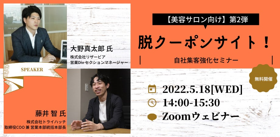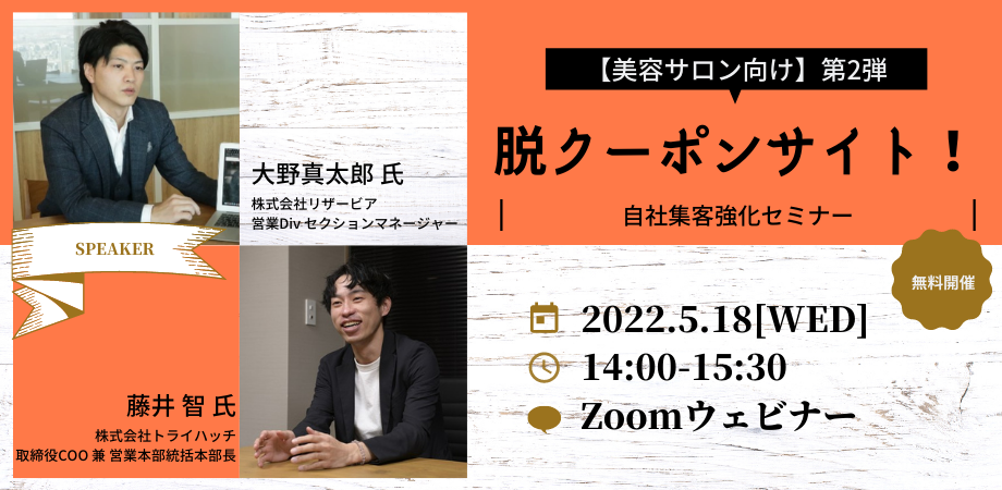 【2022年5月18日(水)14時00分 開催】株式会社トライハッチ×株式会社リザービア共催 【美容サロン向け第2弾】脱クーポンサイト依存!自社集客強化セミナー