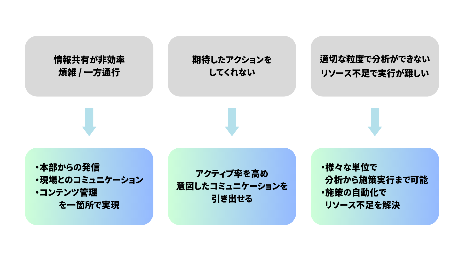 社内のメンバーやパートナー企業の担当者とのオンラインコミュニケーションにおける「見てくれない」「期待しているアクションをしてくれない」等の課題をコミュニティによって解決します。コミュニティのちからで社内のメンバー・パートナー企業とのコラボレーションを強化し、事業成長を加速させます。
