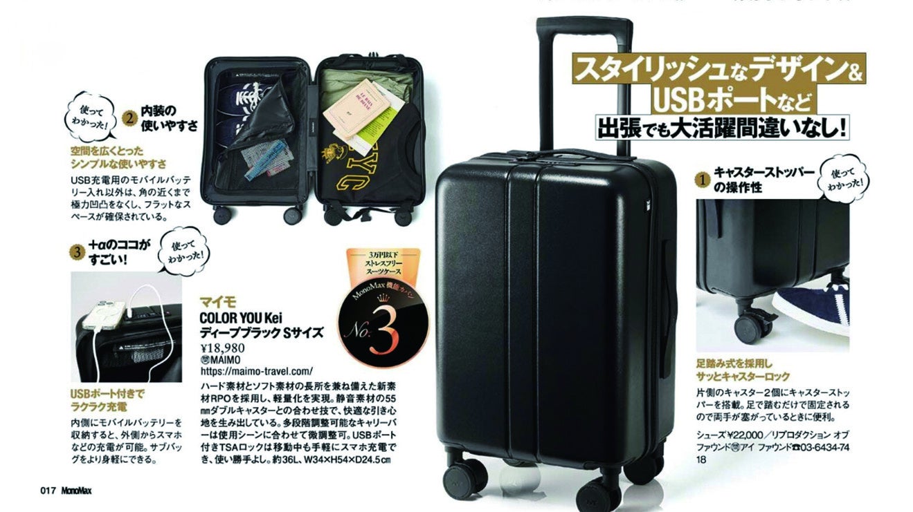 【MAIMO】雑誌『MonoMax』“3万円以下ストレスフリースーツケース”ランキングにて「COLOR YOU Kei」が紹介されました。