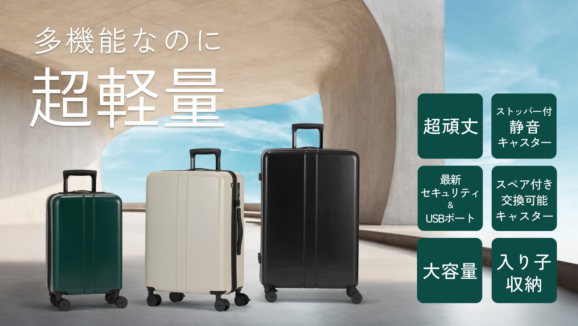 『軽量・軽快、疲れ知らず!』をコンセプトに、満を持して誕生させたMAIMO史上最軽量のスーツケース。新素材RPOを使用し、とことん軽さにこだわりました。もちろん、ストッパー付きキャスターや高い収納力、USBポート付TSAロックなどMAIMOならではの機能はそのまま。