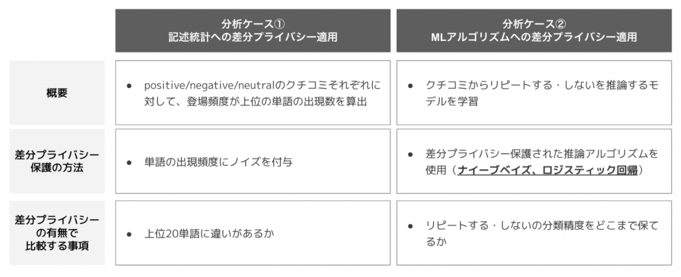 そして分析ケース②では、機械学習アルゴリズムへの差分プライバシー適用を考えました。具体的には、positiveなクチコミを投稿したユーザは「リピートする」、negative・neutralなクチコミを投稿したユーザは「リピートしない」と仮定した上で、クチコミから「リピートする」「リピートしない」を予測する分類問題を解くものです。