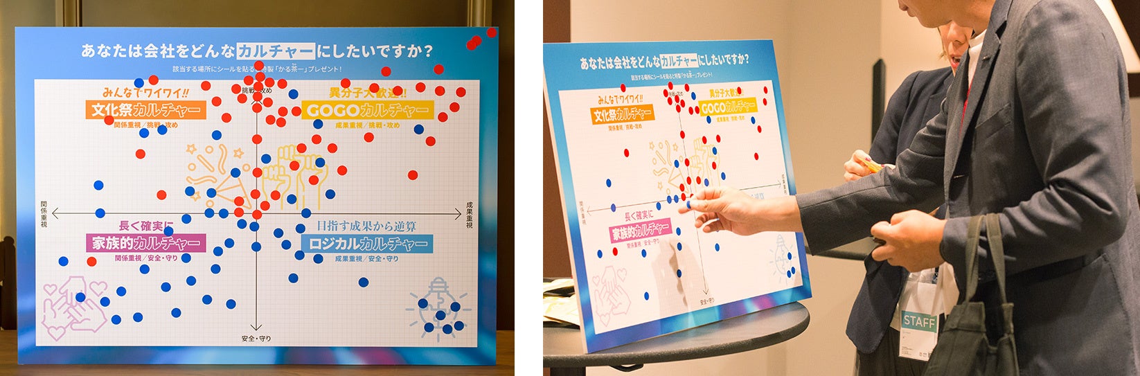 青シールは「今の自社のカルチャー」赤シールは「目指したいカルチャー」を表明いただきました。他社の傾向も見ながら自社を振り返るきっかけになり、コーナーは大盛況でした!