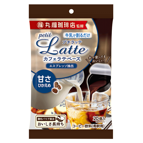 牛乳で割るだけで老舗喫茶店の味わい『丸福珈琲店監修 プチラッテ カフェラテベース』より、甘さひかえめタイプの大容量20個入りを新発売!