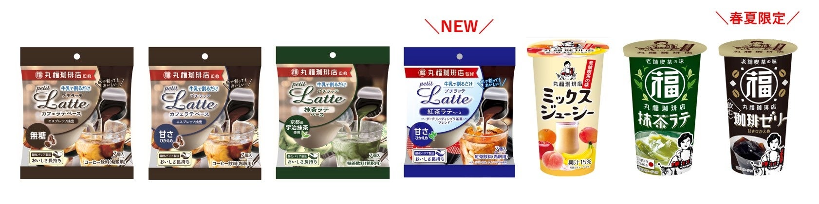 丸福珈琲店監修のシリーズ商品として、丸福珈琲店監修「プチラッテ 抹茶ラテベース」「ミックスジューシー」などを販売中。また、この春新発売の「プチラッテ 紅茶ラテベース」や、季節限定の「飲む珈琲ゼリー」など、様々な味わいをお楽しみください。