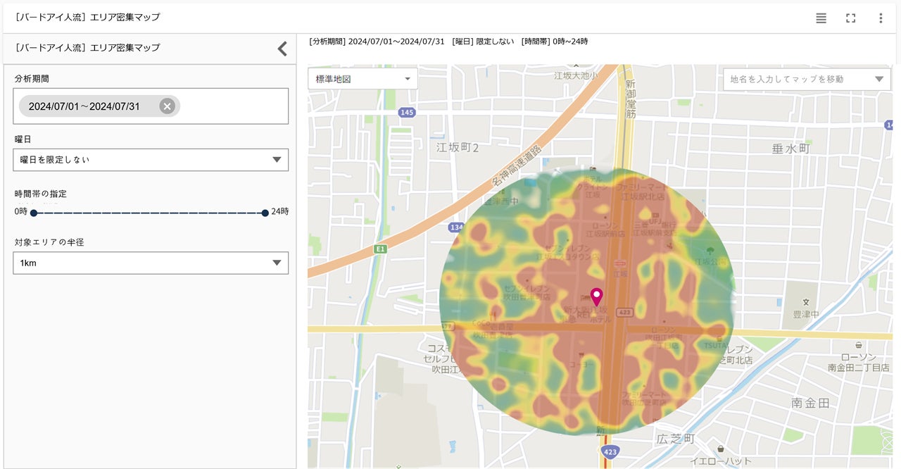 「エリア密集マップ」は、店舗や特定エリアを訪れる人々の動きや、時間帯ごとの人流の密集度合いを把握することをAIによって実現した新ウィジェットです。このマップを使用することで、エリア周辺の混雑状況を把握し、来店者分析、イベントの動員計画、交通混雑緩和対策などに活用できます。