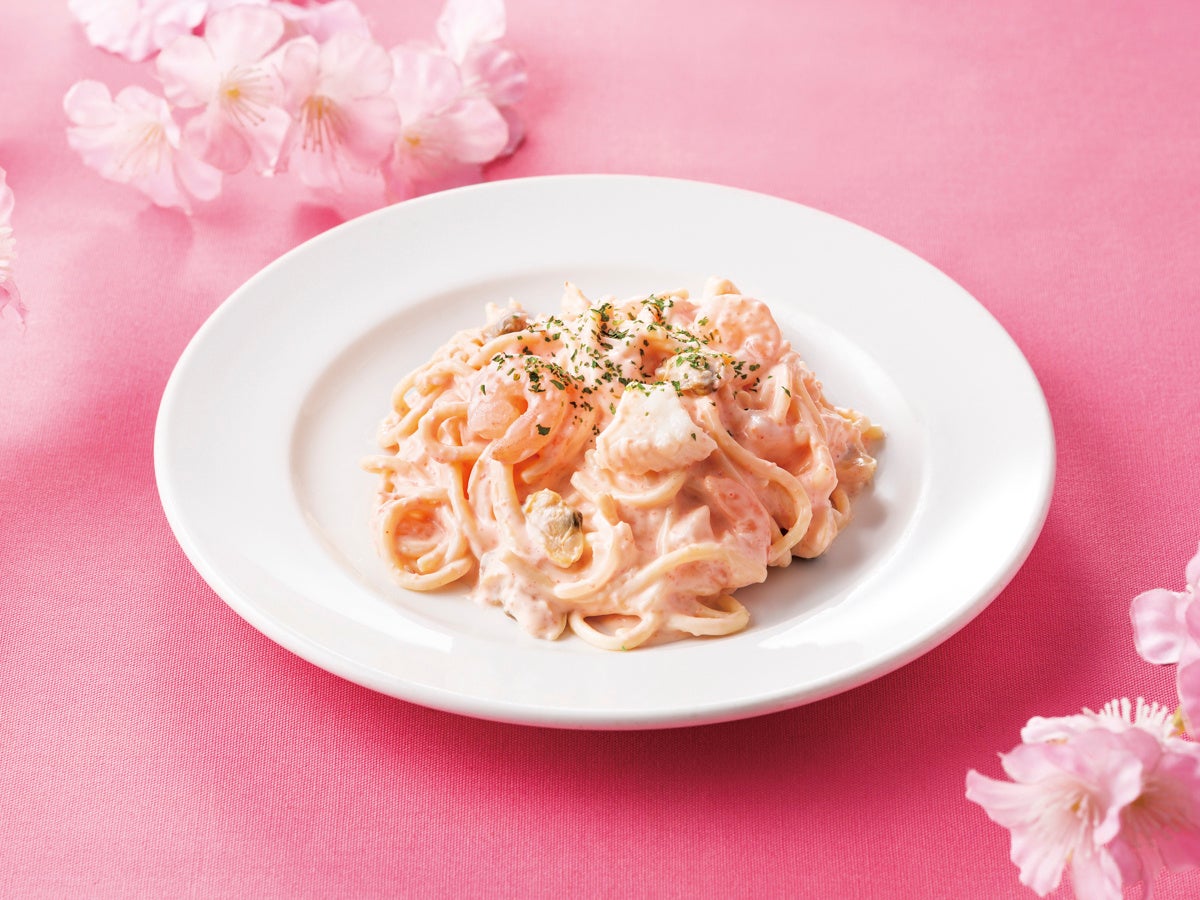 シーフードが入った明太子味のスパゲッティサラダ。春らしいピンク色が目を引きます。