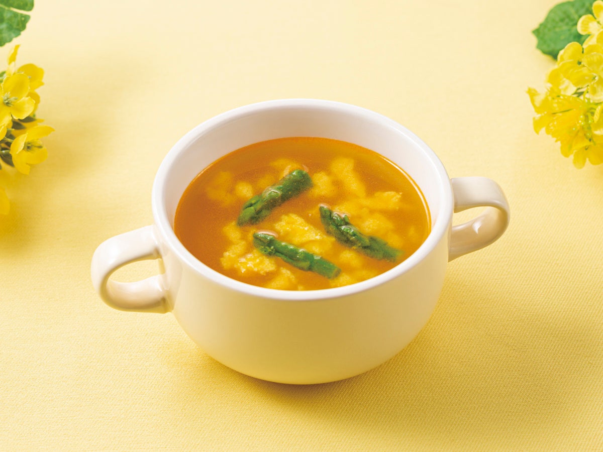 アスパラとたまごが入った塩味のスープ。咲き誇る菜の花畑のようなスープで心は春一色!