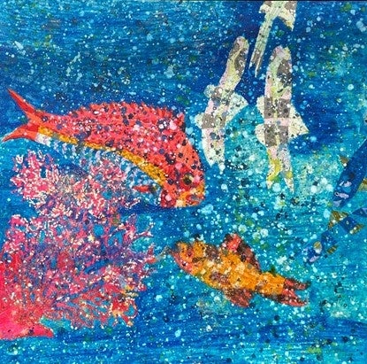 極彩色の海。螺鈿のように色彩が輝いている。海中の様子をきちんと説明しつつ、絵具の鮮やかさとテクスチャが極めて美しい。真ん中の大きい魚が小さい魚を睨め付けているのは、獲物として狙い定めているからだろうか。一秒たりとも同じ瞬間のない、激しい水の流れの中で、生命の坩堝が刹那的にきらめいている。